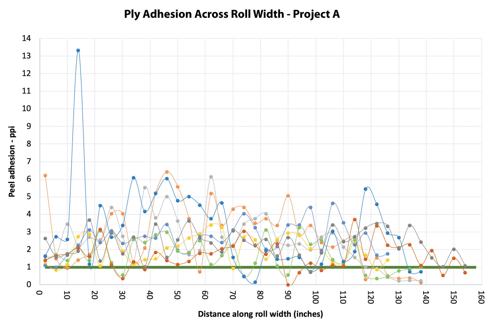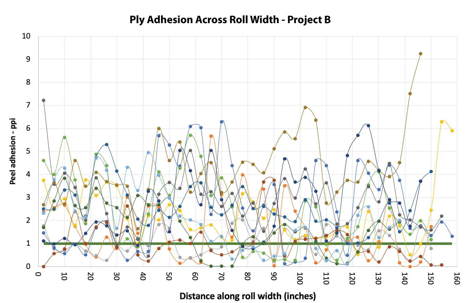 Figures 2 and 3 present peel strength profiles on samples from both sides of 10 different rolls on two separate projects. The thick, solid, horizontal line is the target specification on both projects of 1.0 pound/inch (175 N/m). It is interesting to note that the data sets from both projects coincidentally produced very similar statistics, with average peel strengths for all samples of 2.3 pounds/inch (403 N/m) and with SD of 1.25 pounds/inch (219 N/m), assuming the results are normally distributed. The question is, however, given the high variability, what are the appropriate acceptance criteria for the peel strength profile?