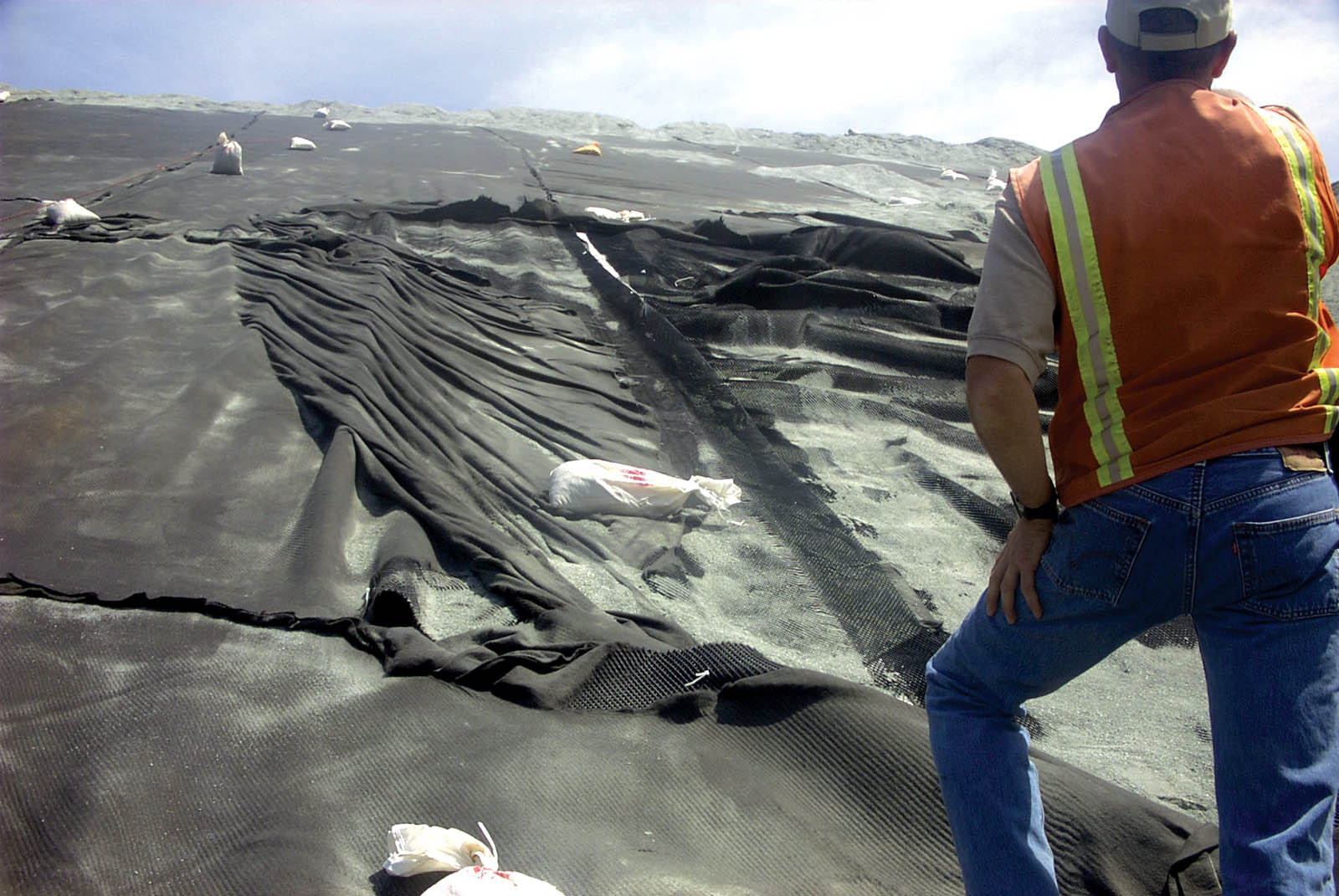 The reason this issue is important is related to shear strength and slope stability. The potential for delamination at the bonded interface is increased by hauling, dumping and spreading cover soil on top of the liner system. The postconstruction condition of this interface will affect the long-term reliability for slope stability.