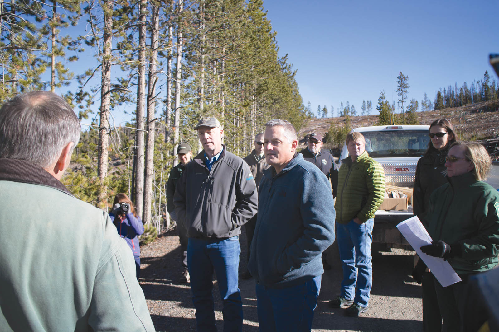 Reps. Bruce Westerman, R-Ark. (right), and Greg Gianforte, R-Mont. (center), discuss issues near Deer Lodge, Mont., on Oct. 30, 2017. Photograph courtesy of the Office of Rep. Greg Gianforte